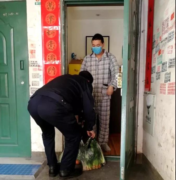 攀鋼釩安全環保(武裝保衛)部護衛大隊黨支部建立“一對一”關懷機制,對居家隔離人員實行24小時動態監控,疏導情緒,激勵信心。圖為2月8日,該黨支部黨員為居家隔離的職工送去生活必需品。(通訊員 徐明川 攝)