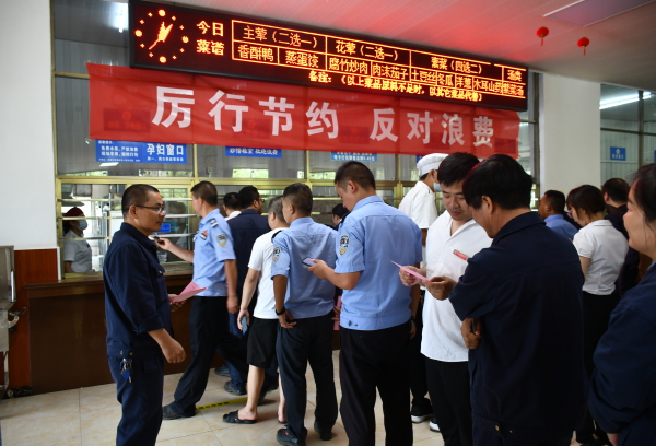 “大家吃多少打多少,不夠再加,謝謝配合!”“你好,這是公司‘厲行節約、反對浪費’宣傳單,請看一下!”……走進方大九鋼食堂,懸掛在窗口前的“厲行節約、反對浪費”標語格外亮眼,食堂內佩戴紅袖章的志愿者正一邊給用餐人員發放“厲行節約”主題宣傳單,一邊提醒大家少量多次、按需取餐,節約糧食。