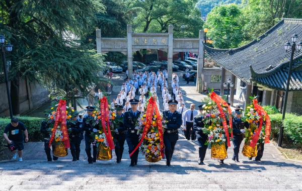 鄰近的革命烈士陵園內,莊嚴肅穆,烈士紀念碑前,全體人員整齊列隊、駐足凝視。敬獻花籃儀式正式開始,全場齊聲高唱《中華人民共和國國歌》。國歌唱畢,全體默哀,向為中國人民解放事業和共和國建設事業英勇獻身的烈士致以崇高敬意。