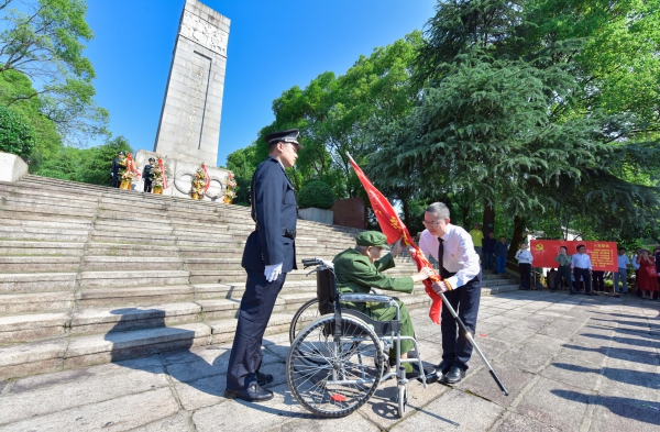 活動現場,已經90多歲高齡的抗日老戰士朱江身著軍服,向黃智華同志授予此次活動旗幟,象征著方大人接過革命前輩傳下來的革命精神“接力棒”,接過責任和擔當。