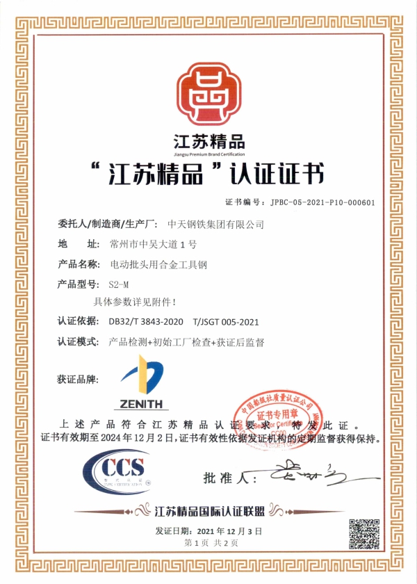 通過本次認證的產品合金工具鋼S2主要用于加工電動批頭,其產品具有良好的耐磨性、高硬度、高韌性、能承受高扭矩、使用壽命長。目前,中天集團合金工具鋼S2年產達1.5萬噸,國內市場占比達60%,下游客戶包括世達、史丹利、博世等國際一流工具生產企業。鋼簾線用盤條具有純凈度高和組織均勻的特點,可滿足各種線徑、規格和結構的鋼簾線生產加工要求,年銷售量在40萬噸以上,用戶涵蓋國內外知名簾線鋼制造商。