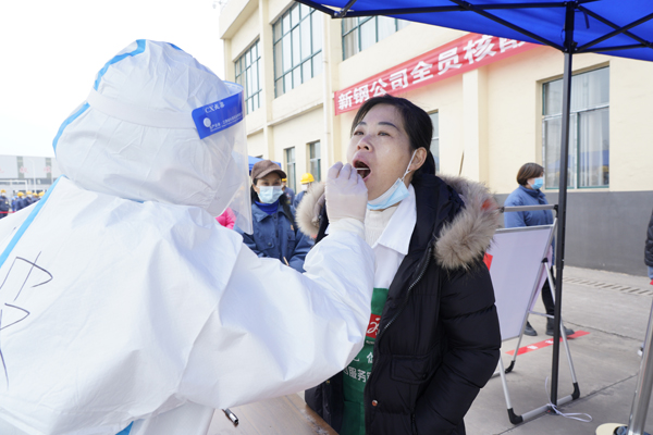 1月14日,新余鋼鐵集團有限公司全員核酸檢測模擬演練在該公司綜合原料主控樓下舉行,演練歷時1小時,共完成樣本采集量400份。由于前期工作準備充分,在多個檢測點,每名職工一份核酸檢測標本采集時間僅需30秒。圖為職工正在接受核酸檢測。 (特約通訊員 歐陽斯娟 攝)