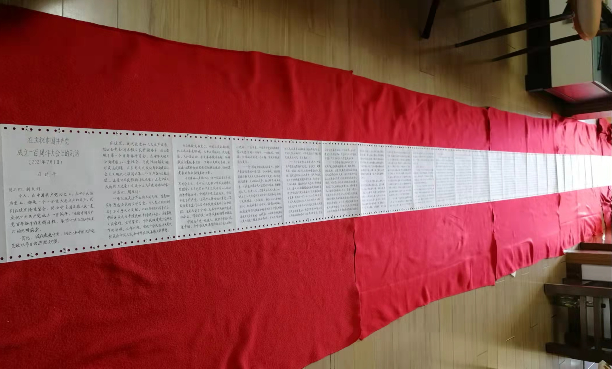 為了慶祝和紀(jì)念中國共產(chǎn)黨建黨一百周年,近日,中國寶武集團馬鋼丁根在一張空白計算機卷紙上用鋼筆工工整整地抄寫了十多萬字的《習(xí)近平在慶祝中國共產(chǎn)黨成立100周年大會上的講話》全文(計7300余字)和由中共中央黨史和文獻研究院編撰的《中國共產(chǎn)黨100年大事記(1921年7月- 2021年6月)》全文(計約9萬8千字)。作品字?jǐn)?shù)合計達(dá)到10萬5千多個,總長度近60米,據(jù)說可以申報吉尼斯世界紀(jì)錄。