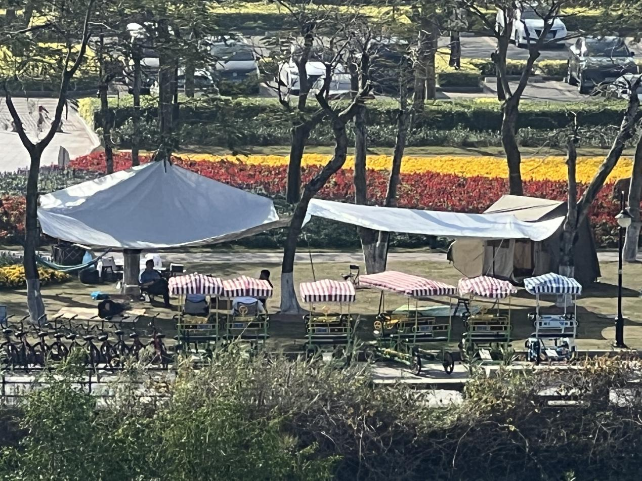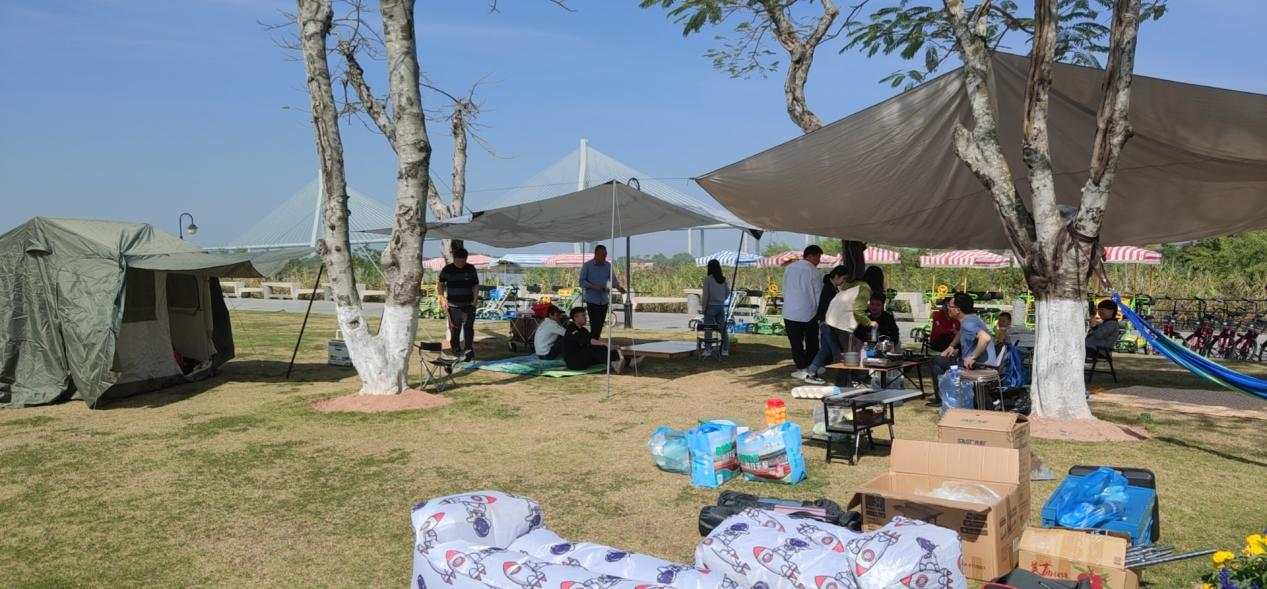 活動在搭帳篷中展開,大家積極參與,分工協作,不一會兒,兩個寬敞的天幕和帳篷便搭好了。在遮陽棚下,大家一起進行了烤串、分享美食,打紙牌、踩氣球、比大小等趣味活動,為贏得榮譽,每個人都熱情高漲,你追我趕,奮勇爭先,現場充滿了歡聲笑語,氣氛愉快而熱烈。活動結束后,依據比賽結果給大家分發了洗衣液、香皂等活動禮品。