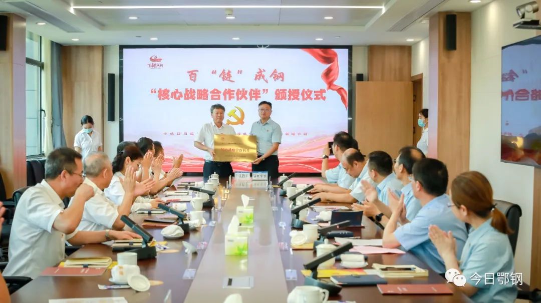 中鐵四局物資公司為鄂城鋼鐵頒授“核心戰(zhàn)略合作伙伴”獎牌。