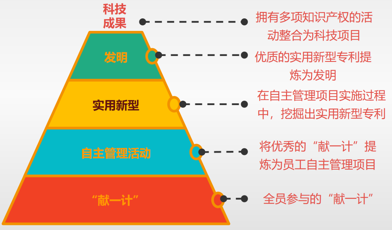 沒有制度的創新就如同無源之水,黨支部組織骨干認真解析公司創新方面的制度辦法,形成了黨支部創新“金字塔”,第一層以“獻一計”活動為載體,引導員工立足崗位積極獻計;第二層將獻計轉化為員工自主管理項目,推進員工獻計有效實施;第三層注重實施成果的提煉和挖掘,形成知識產權;第四層將要優質的實用新型專利提煉為發明;最后一層將擁有多項知識產權的活動整合為科技項目。