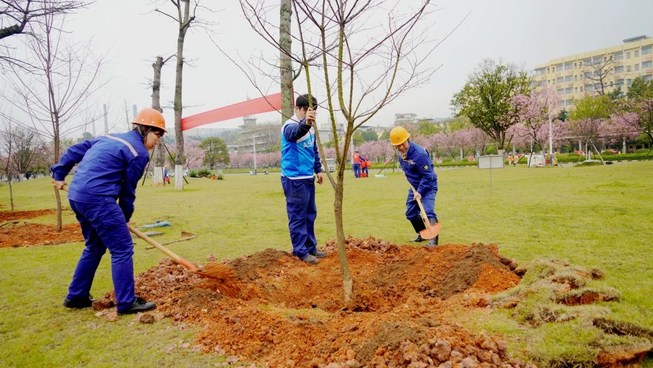 活動中,大家三五成組,配合默契,充分發揮團隊協作精神,或放苗扶樹,或揮鍬填土,或提水澆灌,有條不紊完成每一道工序。在大家的辛勤勞動下,一棵棵櫻花樹苗被栽進沃土,挺立在和煦的春風中。本次共種植139棵櫻花樹,至此中南股份廠區已總共種植2236棵櫻花樹。