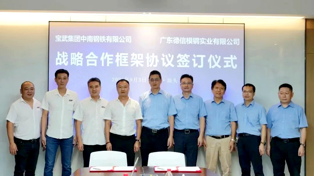 9月3日,中南鋼鐵與德信模鋼在汕頭簽訂戰(zhàn)略合作協(xié)議,雙方將在中厚板品種的供應(yīng)和服務(wù)、技術(shù)研發(fā)及供應(yīng)鏈延伸等方面開(kāi)展深度合作,促進(jìn)雙方共同發(fā)展,共同構(gòu)建鋼鐵供應(yīng)鏈生態(tài)圈。
