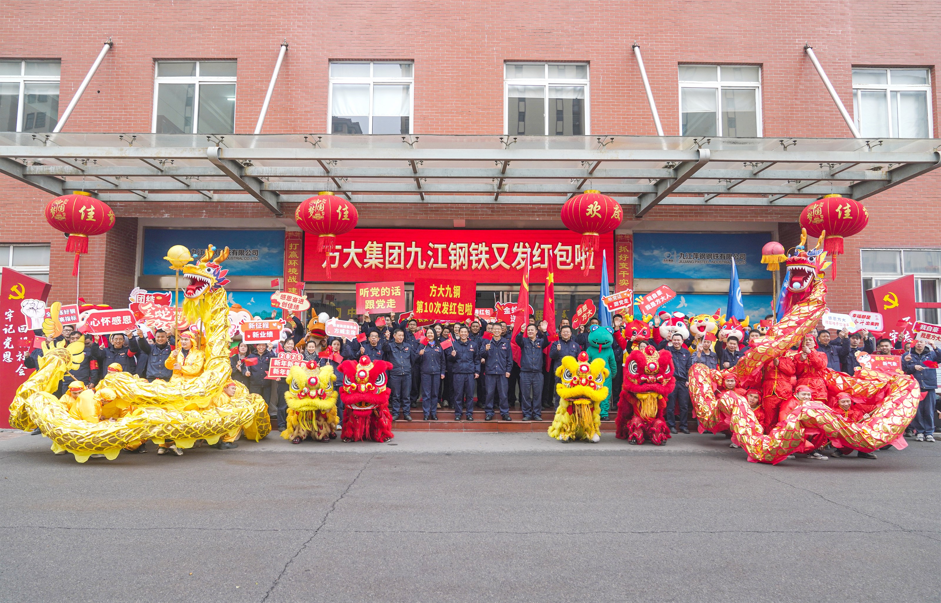 1月24日,方大九鋼處處燈籠高掛、喜氣洋洋、年味濃濃。上午9:58,紅包現金抵達該公司辦公大樓,大家興奮地揮舞著手中的小紅旗,手持“聽黨的話跟黨走”“在方大很幸福”等標語夾道歡迎。現場響徹著《好日子》的歡快旋律,龍騰獅躍、喜氣洋洋。