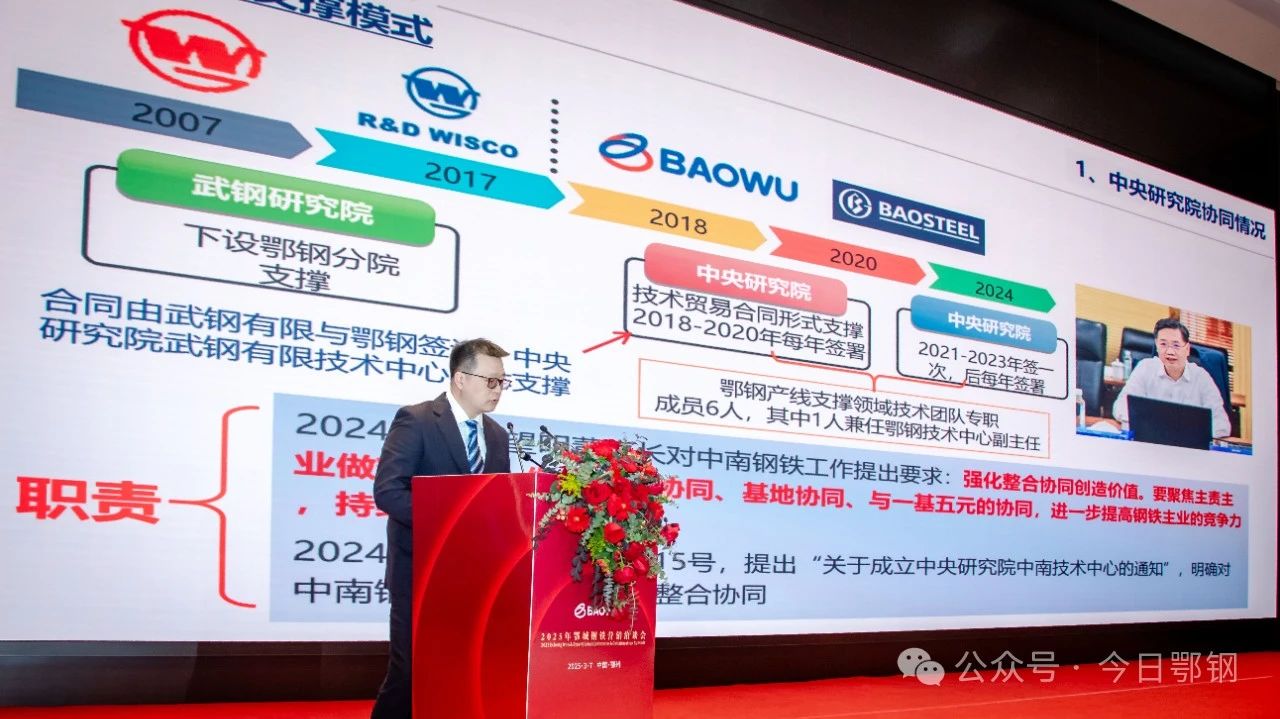 寶武中央研究院武漢分院劉文斌作《鄂鋼寬厚板產(chǎn)品研發(fā)與應(yīng)用》的產(chǎn)品推介報告,展現(xiàn)中國寶武深化產(chǎn)學(xué)研戰(zhàn)略合作,助推鋼鐵產(chǎn)品供給能力提升的科研成果。