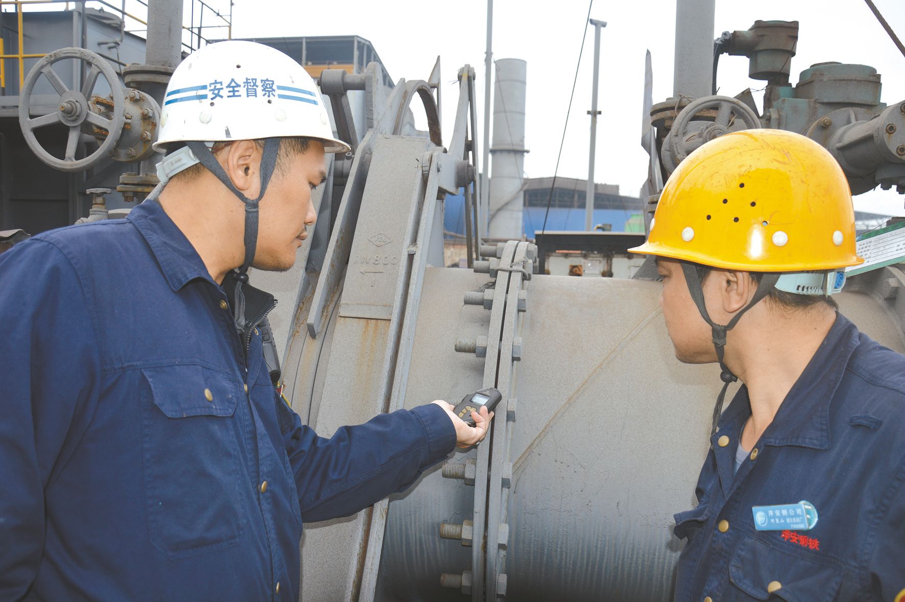圖為方大萍安鋼鐵湘東煉鋼廠安全員葉海(左)正在與職工檢查煤氣電動眼鏡閥。 (彭云桃 供圖)