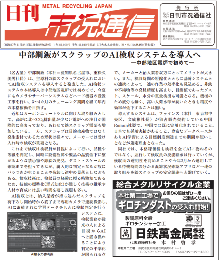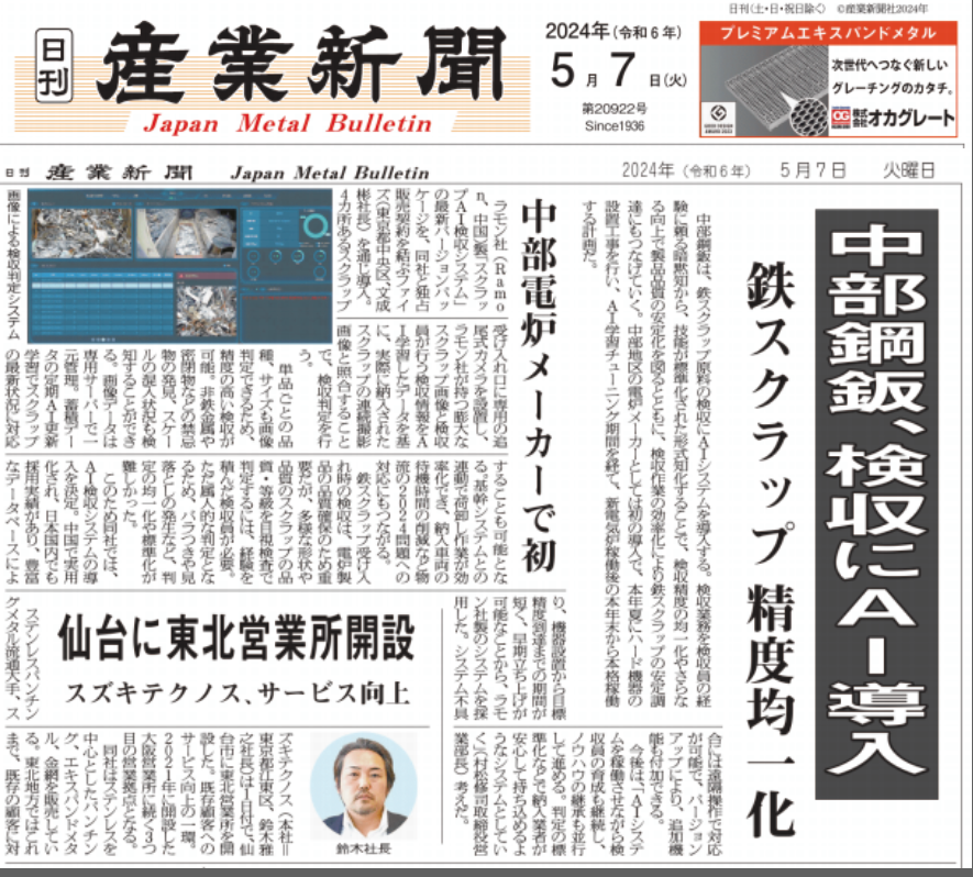 2024年5月7日,日本鋼鐵行業(yè)權(quán)威媒體“鋼鐵新聞”“產(chǎn)業(yè)新聞”以及“日本市況通信日刊”等媒體重點(diǎn)報(bào)道了日本中部鋼板株式會(huì)社引入鐳目廢鋼智能判級(jí)系統(tǒng)的新聞。
