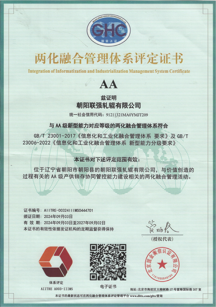 2024年9月2日,聯強軋輥更是成功獲得了兩化融合管理體系AA級認證,標志著該公司不僅在數字化工廠建設上邁出堅實步伐,更在信息化與工業化深度融合方面取得了重大突破,為企業持續健康發 展奠定了堅實基礎。