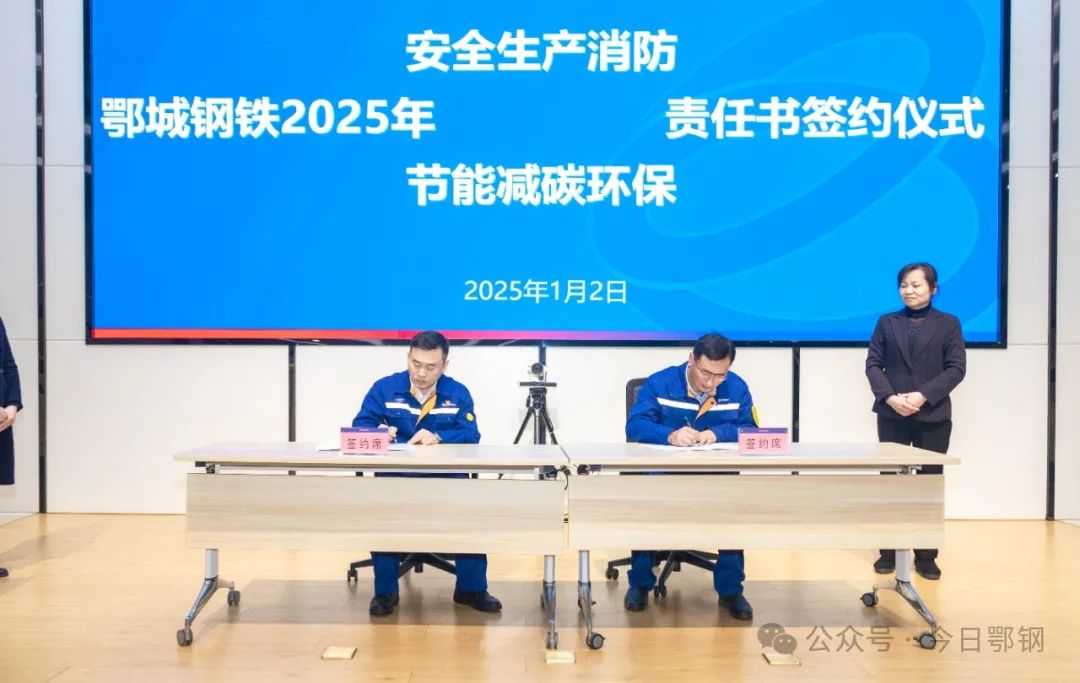 黃大軍代表該公司分別與鋼軋廠、寬厚板廠、安全保衛部、能源環保部現場簽訂了2025年安全生產消防、節能減碳環保責任書。