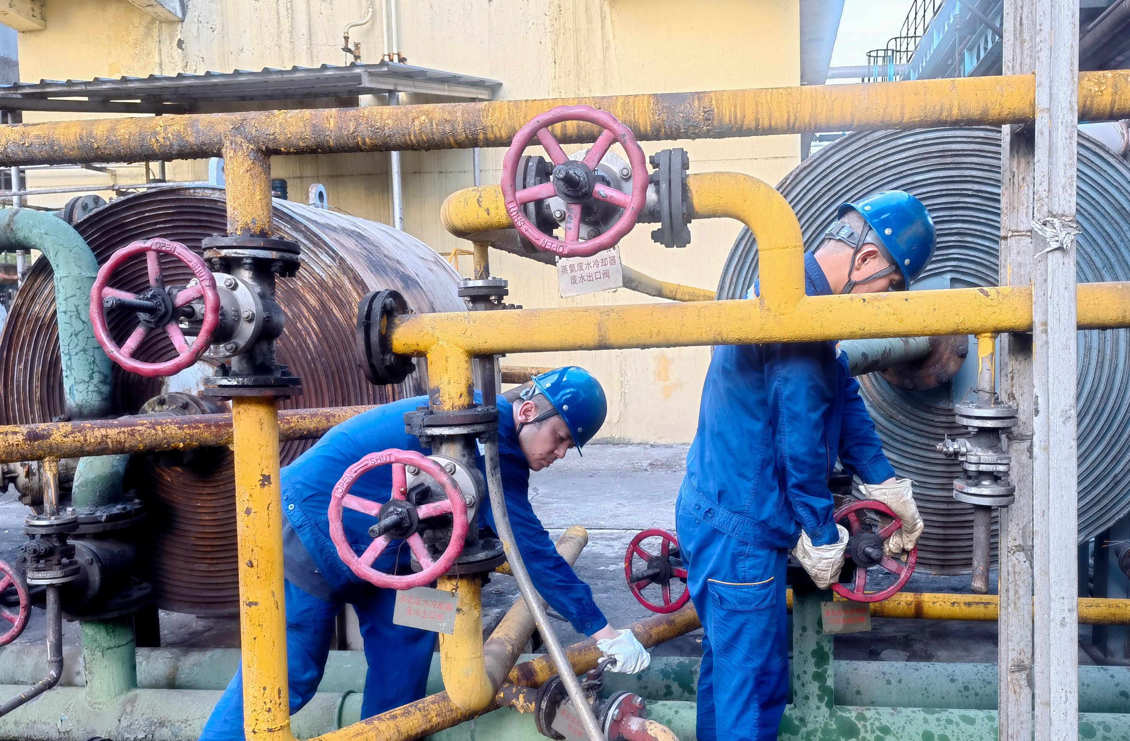 為從根本上解決這一生產難題,化產生產二班并未依賴外部支援,而是立足班組實際自主攻堅,圍繞“安全、高效、徹底”三大核心目標,制定了周密的中夜班專項作業方案。他們精準把握中夜班環境氣溫普遍比白班低5-8℃的天然優勢——這一溫差不僅能減少冷卻器處理過程中熱量反彈對后續操作的干擾,更能降低作業人員在高溫管道周邊作業的安全風險,為優化操作創造了有利條件。