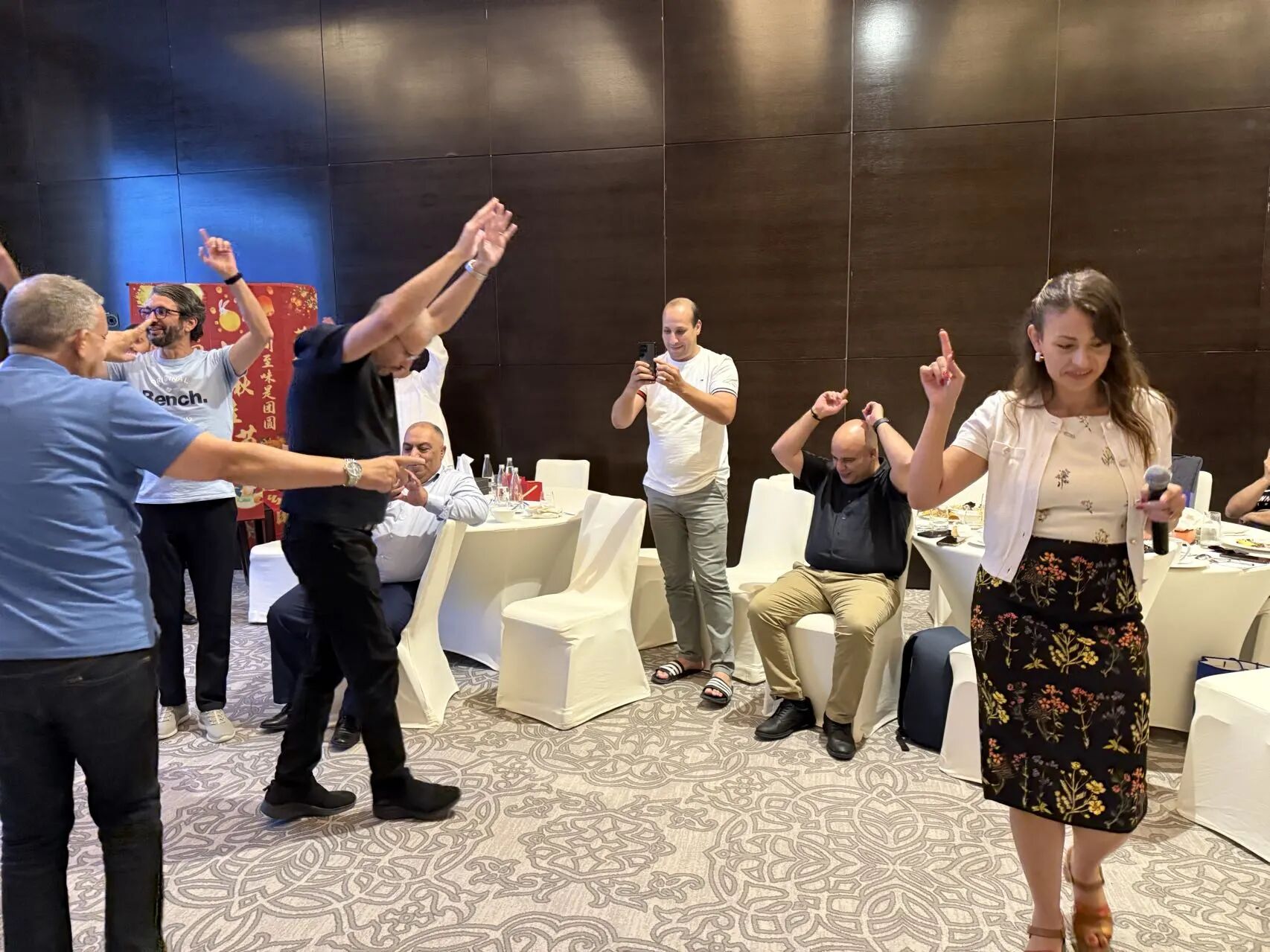為表達對合作伙伴的重視,鐳目團隊在展會前夕,10月6日晚,特別舉辦了以“中秋團圓夜”為主題的文化沉浸式體驗活動。圓月之下,來自卡塔爾鋼鐵(Qatar Steel)、阿爾及利亞卡塔爾鋼鐵(Algerian Qatari Steel)、馬斯喀特鋼廠(Muscat Steel)等多家鋼廠的高層領導齊聚一堂,大家一起猜燈謎、吃月餅、跳舞,與鐳目團隊共度佳節。