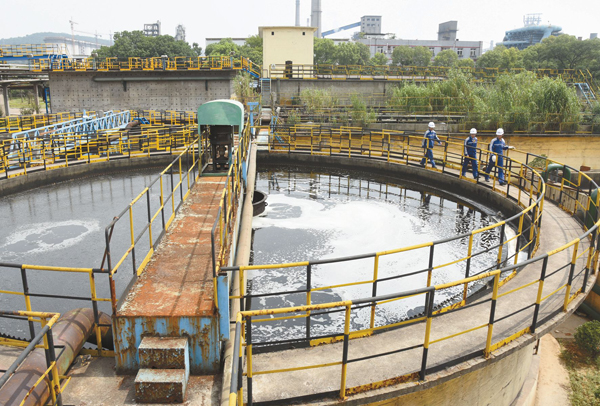 馬鋼化工能源公司南區煤氣生化污水處理系統自2015年投用以來,經過不斷的技術改造,目前該系統出水主要污染物因子氨氮、酚、氰化物、COD指標均大幅優于排放標準要求。該系統項目設計處理能力為135立方米/小時,年處理焦化廢水達100萬噸以上。圖為該公司環保技術人員在觀察系統運行狀況。 (胡智慧 攝)