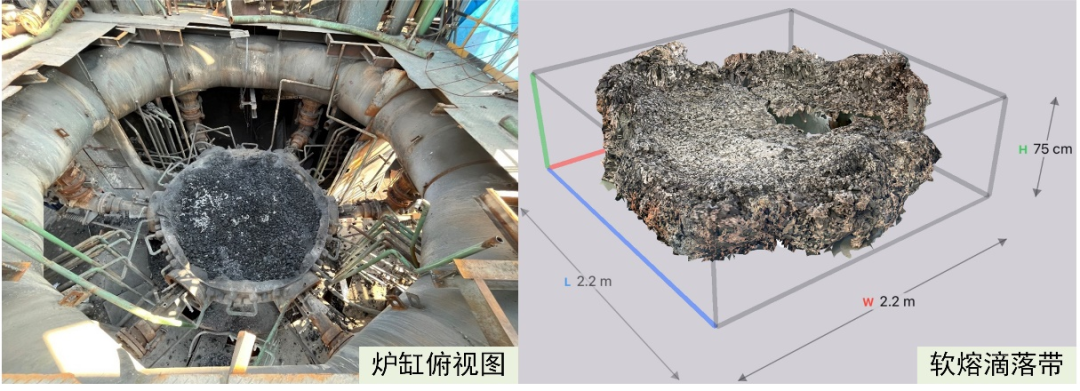 在完成高爐富氫冶煉熱態試驗后,該研發團隊向爐內注入氣—液混合氮,對試驗高爐內熱態爐料進行快速“冷凍”,完整保留了爐內物料變化細節。依托可解剖打開式爐體結構,該研發團隊對“冷凍”后的試驗高爐進行了歷時3個月的解剖工作,獲取了高爐塊狀帶、軟熔帶、滴落帶、風口區、死料柱、渣鐵層等關鍵物料樣品及相關數據信息,通過“打開高爐黑箱”,徹底弄清楚了富氫對高爐爐料結構和性狀變化的作用規律,構建了完整的高爐富氫低碳煉鐵過程技術理論和工藝原型。