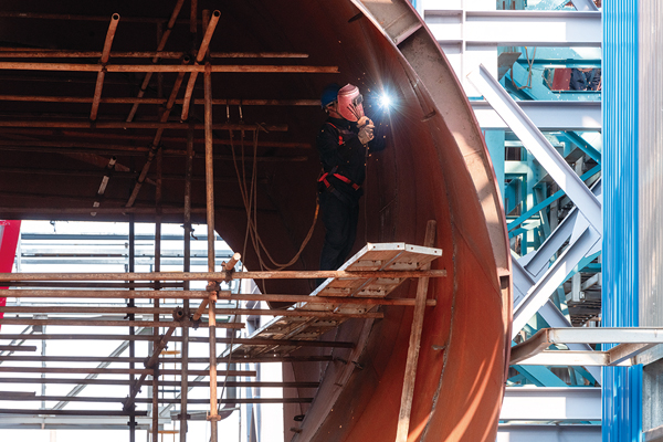圖為施工人員搶抓燒結機機頭布袋除塵保溫層安裝進度。