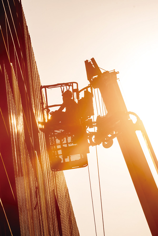 圖為施工人員在安裝廠房外墻彩鋼瓦。