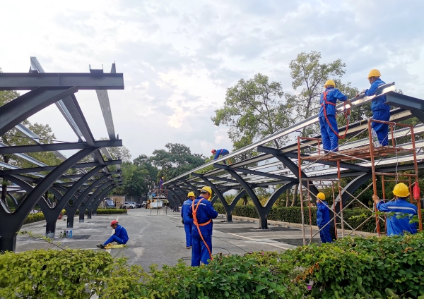 在韶鋼717小鎮,361塊光伏面板像“藍色盔甲”一般巍然立于車棚及辦公樓上方,在為建筑物“遮風擋雨”的同時,源源不斷地輸送電源。韶鋼光伏發電項目(一期)采用“自發自用、余電上網”運營模式,總裝機容量28.924MWp,預計年發電量2380萬千瓦時。該項目采用國內最新光伏技術,通過光伏板、逆變器等系統裝置,將太陽能轉變為電能,直流電轉為交流電,最高輸出電壓可以達到10kV。每年能為公司節約外購電成本、碳交易指標的同時,最大程度實現生態效益、經濟效益和社會效益有機統一,展示韶鋼在超低排放、綠色發展和智慧能源方面的新突破與新成效。