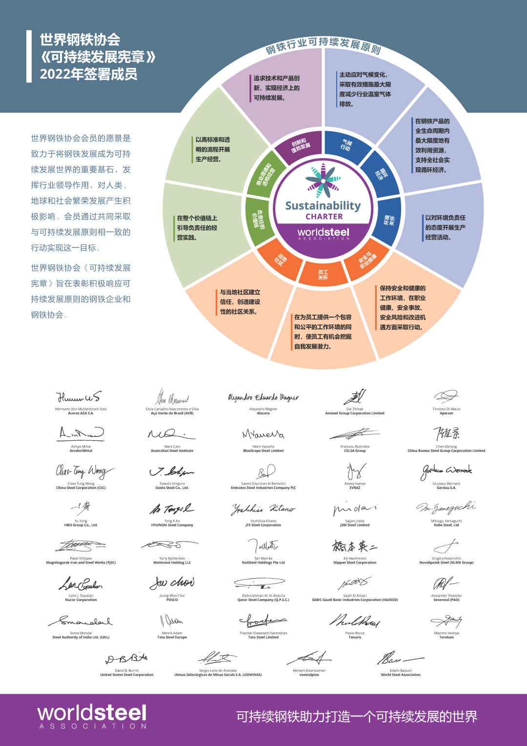 世界鋼鐵協會《可持續發展憲章》于2009年首發,每三年評審和修訂一次,新版《可持續發展憲章》包括9項可持續發展原則及其20條標準,內容涵蓋應對氣候變化行動、循環經濟、安全與健康、商業道德、創新與經濟繁榮等多個領域,反映鋼鐵行業對可持續發展的關注度日益提升,以及對人類、我們的地球和社會繁榮產生積極影響所擔負的責任。