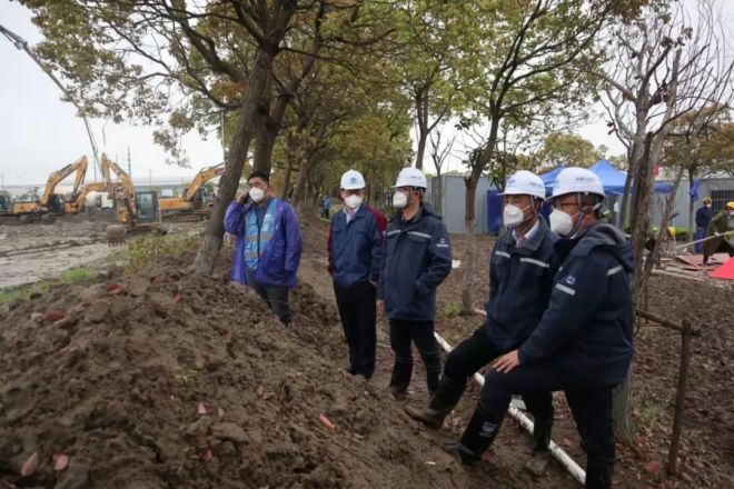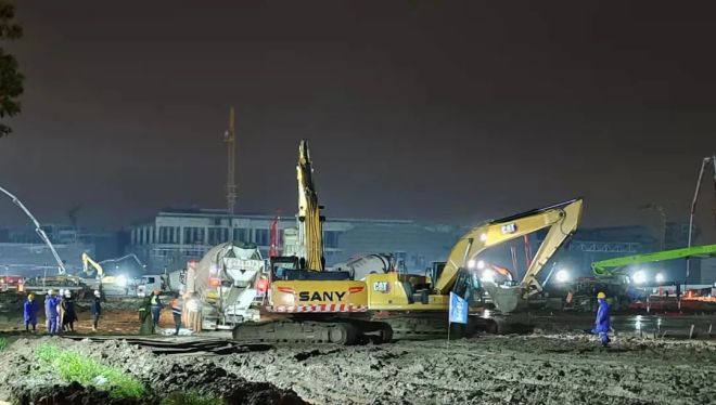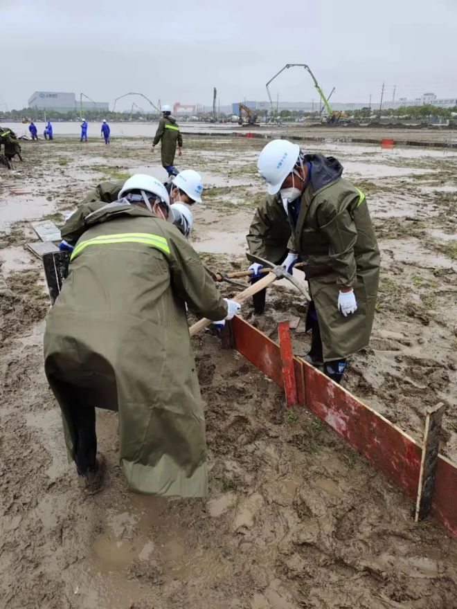 公司以項目管理部副部長吳民、安監(jiān)部副部長魏寧為代表的黨員骨干,從馬鞍山本部陸續(xù)集結100余人作業(yè)力量,全體完成核酸檢測后于4月13日下午17時增援上海。次日上午8:30分左右,十七冶首批援建隊伍達到現(xiàn)場,旋即成立黨員突擊隊、黨員先鋒隊,勇?lián)w建設者的“主心骨”。工作組立即部署工作任務,馬不停蹄投入施工。截止4月14日晚,現(xiàn)場累計投入施工力量300余人,推土機、壓路機、挖掘機、吊車、汽車泵等施工機械44臺,運輸車輛20余臺,混凝土攪拌車數(shù)十輛。機器沸騰轟鳴、人流穿梭不息,還有沙啞著嗓子互相鼓勁聲,正不斷注入“靜態(tài)”下的上海“動能”。建設者們不畏艱險、不知疲倦,與疫魔爭分奪秒,澆筑混凝土1000立方米,土地平整27000平方米。為了給建成交付多爭取一秒時間,冒雨入場300余人的“急行軍”搶先施工。當天夜里,周金龍副總經(jīng)理帶領工作組連夜優(yōu)化施工組織,制定應對現(xiàn)場積水、加快作業(yè)面趕工措施。