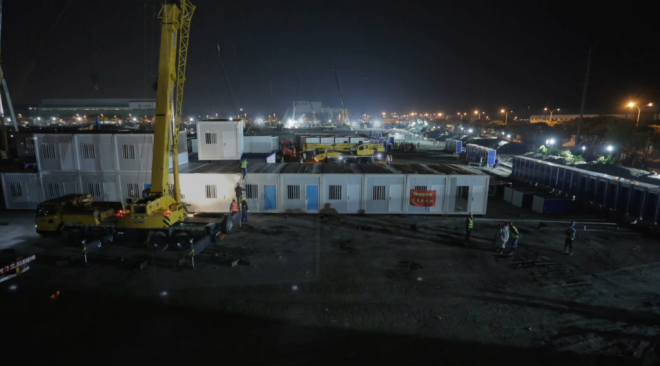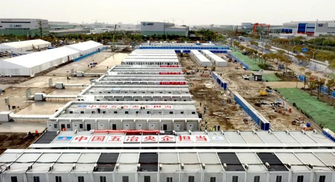 系統聯動、分進合擊,展現五冶全產業鏈管理優勢。為保障工期順利實現,在公司的統一部署安排下,由上海公司負責土建、工程總承包公司負責水電和成品集裝箱安裝、三公司負責圍擋和部分水電、交通市政公司負責場平及地下管網和施工機械保障、工程技術服務公司負責裝備車輛運輸及吊裝,建筑設計研究院負責臨港方艙醫院隔離區和安全區的設計深化工作,華東公司、五公司參與籌集建設物資發往臨港建設現場。同時,公司物資部緊抓集裝箱籌集調運,緊急從江蘇蘇州、山東濰坊、安徽蚌埠、湖北武漢等地來籌集集裝箱,并克服上海全域封控等系列問題,在最短時間內籌集到各類工程車輛和機械設備;公司防疫辦緊急籌集充足防疫物資運往一線,保障項目封閉建設期間現場人員安全無虞。