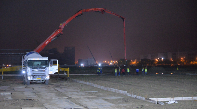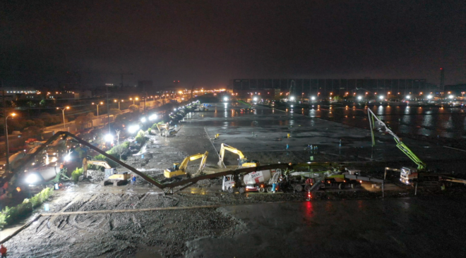 奮勇拼搏、連戰連捷,展現五冶建設團隊精神風采。4月13日晚,臨港突降大雨,氣溫驟降,場地泥濘,進一步升高了施工難度。五冶項目團隊加大了機械設備和人員力量的投入,鋪設鋼板,打通設備進場道口,場地排水和混凝土澆筑同時進行,經過兩晝夜的不懈努力,順利完成了近5000立方米的混凝土澆筑作業。連日來,面對項目體量大、工期短、施工難度大,設計要求高、人員及物資調配困難等一系列難題和挑戰,五冶臨港項目設計團隊、建設團隊、保障團隊密切配合,黨員干部、青年骨干帶頭沖鋒,凝聚項目建設強大合力,連克難關,不斷取得新進展:截止4月19日,場地平整完成5.12萬平米,排水溝開挖、安裝完成1700米,鋪設鋼板、路基箱、整修便道1610米,場地混凝土澆筑16000立方米,水電管線6600米、圍擋完成2400米、集裝箱進場1624個、空調及配套設施安裝404臺;承建的各個區域及配套設施均滿足交付條件。
