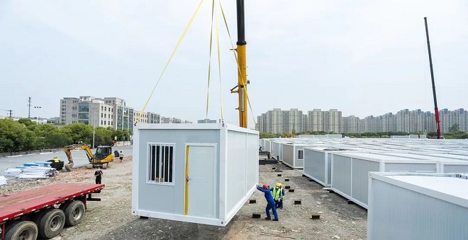 起跑就是沖刺,開局就是決戰。面對極限工期,公司千余名建設者、數百臺各類施工機械通宵鏖戰、晝夜不停工。場地平整、混凝土澆筑、集裝箱吊裝、水電安裝、弱電智能等數十個專業交叉作業、同步推進,隔離點建設分秒必爭,與疫情搶跑。因該項目采取設計施工一體化建設模式,設計公司勘察設計團隊4月30日深夜即抵達施工現場,2小時完成設計平面布置及設備材料計劃提報,6小時完成項目施工圖,為現場快速采購、科學規劃施工節點提供了有力保障。面對項目極限工期下的大規模物資采購及運輸,兩級公司經營系統抽調精兵強將24小時掛圖作戰,從華東六省緊急調配部署集裝箱1000余個,首批集裝箱5月1日凌晨即抵達施工現場。