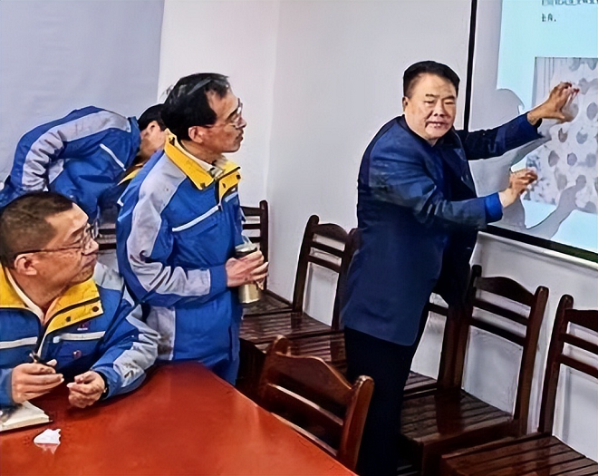 圖為豫興公司董事長劉世聚(右)在給馬鋼煉鐵技術人員講解豫興懸鏈線頂燃式熱風爐內部格子磚的性能及使用要點。