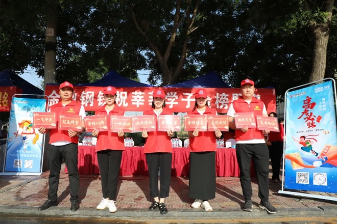 “紅馬甲”一早便到達考點,用心布置,在考點設置了愛心助考站,向考生提供免費的礦泉水、考試文具、口罩等愛心物資,以備考生不時之需,提前準備條幅“金鼎鋼鐵集團祝莘莘學子金榜題名”為考生及家長加油鼓氣。