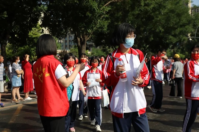 “不用緊張,好好考。”“加油,一定要相信自己!”“紅馬甲”溫情地送上鼓勵的話語、礦泉水及綠豆湯,鼓勵考生放平心態、沉著應考,用實際行動為考生加油。