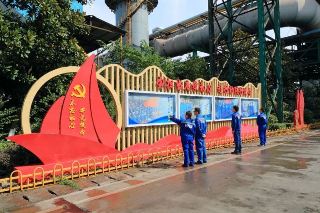 三煉鋼員工駐足在廠區黨建宣傳欄(陳明 攝)