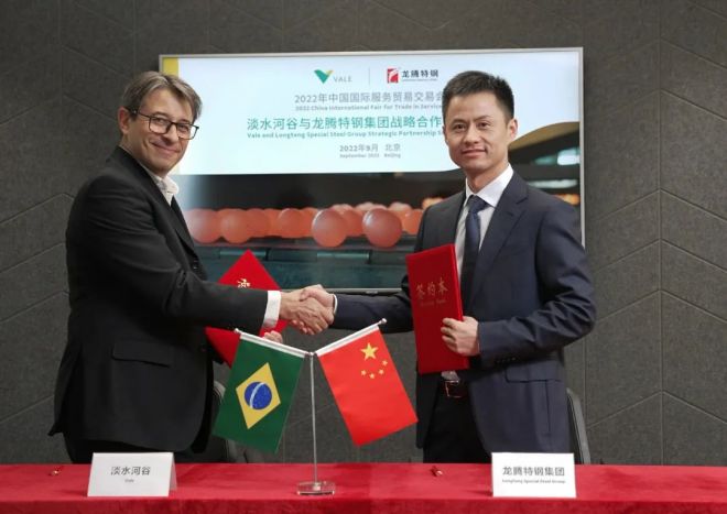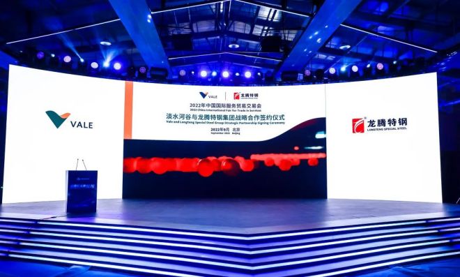 中國北京,2022年9月2日,2022年中國國際服務貿易交易會(以下簡稱服貿會),常熟市龍騰特種鋼有限公司(以下簡稱龍騰特鋼集團)旗下的常熟市龍特耐磨球有限公司以線上線下相結合的方式,與巴西淡水河谷簽約延長戰略合作伙伴關系,這是雙方首度亮相服貿會。