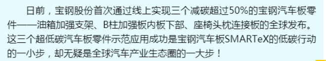 寶鋼股份作為全球最大、品種最全、綜合競爭力最強的汽車鋼板供應(yīng)商,在產(chǎn)業(yè)大變革、行業(yè)大顛覆的時代,不僅僅是持續(xù)提升寶鋼汽車板QCDDS核心競爭力,打造SMARTeX成為全球汽車板TOP1品牌,更是在低碳化上進行了大量的實實在在的研發(fā)和行動,未來寶鋼汽車板SMARTeX將更加精彩,我們共同期待“碳中和”時代的到來。