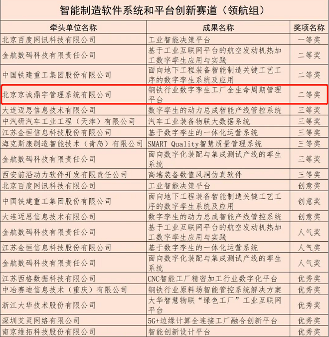 11月23日,以“數智賦能,鏈通未來”為主題的世界智能制造大會盛大開幕,第二屆智能制造創新大賽頒獎儀式在大會開幕式上隆重舉行。中冶京誠鼎宇公司申報的“鋼鐵行業數字孿生工廠全生命周期管理平臺”脫穎而出,榮獲軟件系統與平臺創新賽道高級別組別領航組二等獎,名列鋼鐵行業參賽作品第一的好成績。