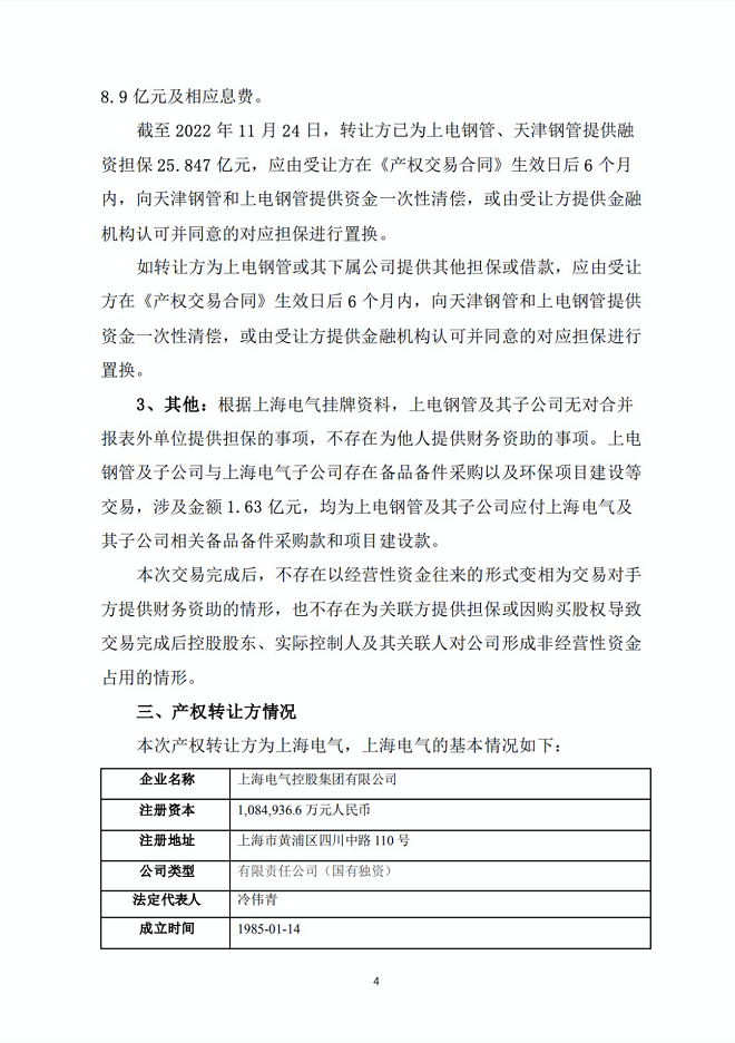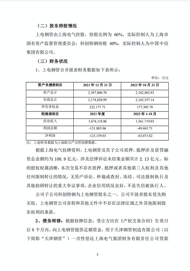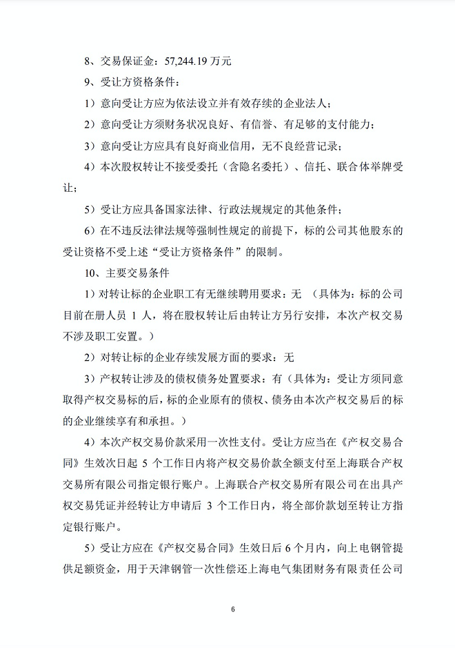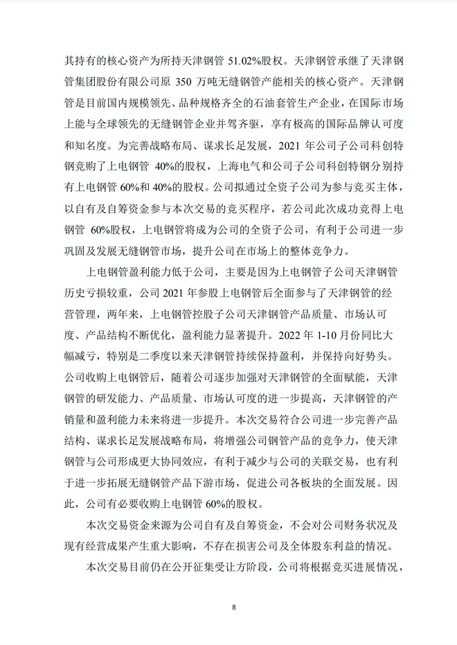 上電鋼管是上海電氣為控股天津鋼管而專門設立的一家平臺公司,其持有的核心資產為所持天津鋼管51.02%股權。天津鋼管承繼了天津鋼管集團股份有限公司原350萬噸無縫鋼管產能相關的核心資產。天津鋼管是目前國內規模領先、品種規格齊全的石油套管生產企業,在國際市場上能與全球領先的無縫鋼管企業并駕齊驅,享有極高的國際品牌認可度和知名度。為完善戰略布局、謀求長足發展,2021年中信特鋼(以下簡稱“公司”)子公司科創特鋼競購了上電鋼管40%的股權,上海電氣和公司子公司科創特鋼分別持有上電鋼管60%和40%的股權。公司擬通過全資子公司為參與競買主體,以自有及自籌資金參與本次交易的競買程序,若公司此次成功競得上電鋼管60%股權,上電鋼管將成為公司的全資子公司,有利于公司進一步 鞏固及發展無縫鋼管市場,提升公司在市場上的整體競爭力。