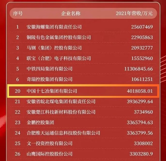 12月12日,安徽省企業聯合會、省企業家聯合會發布2022安徽省百強企業榜單,中國十七冶集團穩居安徽省百強企業第20位。