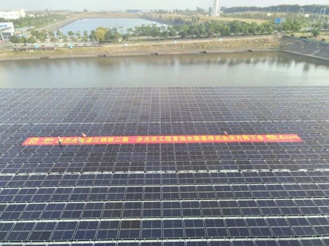 湛江鋼鐵光伏發電項目二期(一步)工程涉及水面、地面、屋面,是海陸空全領域分布式光伏發電項目,總裝機容量為46.89兆瓦,相當于每年節約標煤1.57萬噸,減排二氧化碳4.69萬噸,每年將給湛江鋼鐵帶來近五千萬千瓦時的綠色能源。