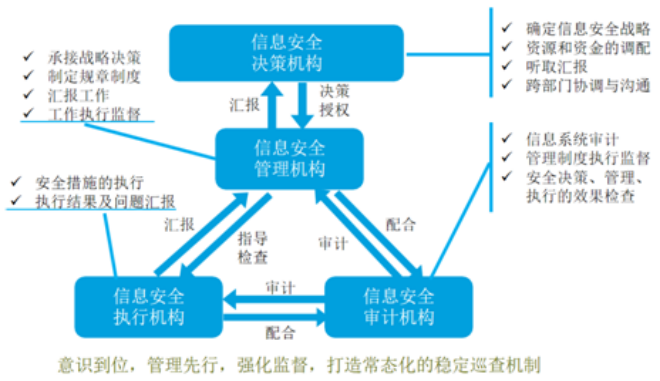集團(tuán)信息安全頂層規(guī)劃和集團(tuán)發(fā)展戰(zhàn)略相融合。各企業(yè)管理、制度承接融合,一總部多基地協(xié)同、密切建設(shè)信息安全組織和決策體系,制定了集團(tuán)“全員參與、嚴(yán)控風(fēng)險、綜合防范、永續(xù)經(jīng)營”的信息安全管理總體方針,統(tǒng)一了制度規(guī)范和安全標(biāo)準(zhǔn),實(shí)現(xiàn)了五大信息安全管理目標(biāo)。