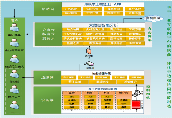 在建設(shè)過程中對大煉鐵產(chǎn)線L1-L2自動化系統(tǒng)進(jìn)行升級改造,同時在此基礎(chǔ)上綜合運(yùn)用“物、大、智、云、移”技術(shù)進(jìn)行煉鐵產(chǎn)線智能化建設(shè),總體采用云邊端的工業(yè)互聯(lián)網(wǎng)新型架構(gòu)進(jìn)行功能頂層設(shè)計以及架構(gòu)頂層設(shè)計。
