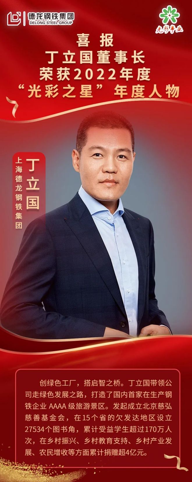 2月21日,中國光彩事業(yè)促進(jìn)會在北京舉辦了2022年度“光彩之星”集中發(fā)布推介,表彰了一批促進(jìn)鄉(xiāng)村振興、助力共同富裕的優(yōu)秀民營企業(yè)家,德龍鋼鐵集團(tuán)董事長丁立國榮獲2022年度“光彩之星”年度人物。