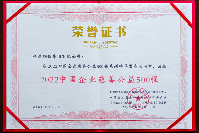 近日,2022中國企業慈善公益500強發布暨第六屆中國企業慈善公益論壇在重慶涪陵舉行,金鼎鋼鐵集團榮獲“2022中國企業慈善公益500強”榮譽稱號。