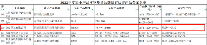 近日,中國鋼鐵工業(yè)協(xié)會發(fā)布2022年度冶金產(chǎn)品實物質(zhì)量品牌培育認定結(jié)果的公示,金鼎申報的鋼筋混凝土用熱軋光圓鋼筋HPB300(線材)產(chǎn)品被冠名為“金杯優(yōu)質(zhì)產(chǎn)品”!