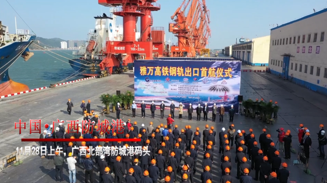 ▲2020年11月28日上午,在廣西防城港碼頭舉行“雅萬高鐵鋼軌出口首航儀式”。