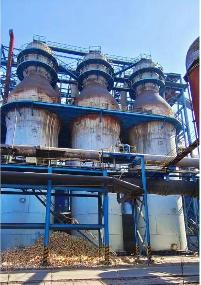 圖1為大修前的吉林某鋼鐵公司熱風(fēng)爐,其熱風(fēng)出口及拱頂?shù)闹瓮邪搴蛢?nèi)部局部爐殼也高溫嚴(yán)重碳化