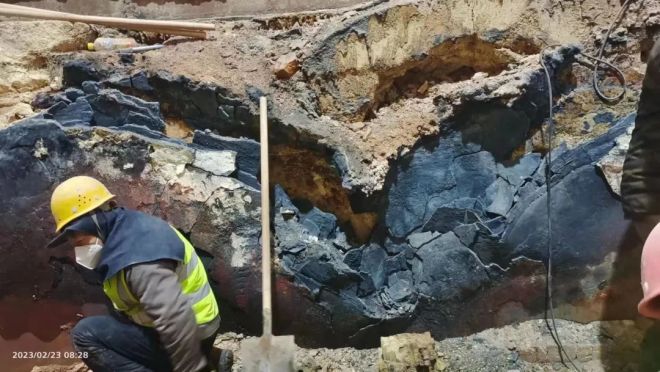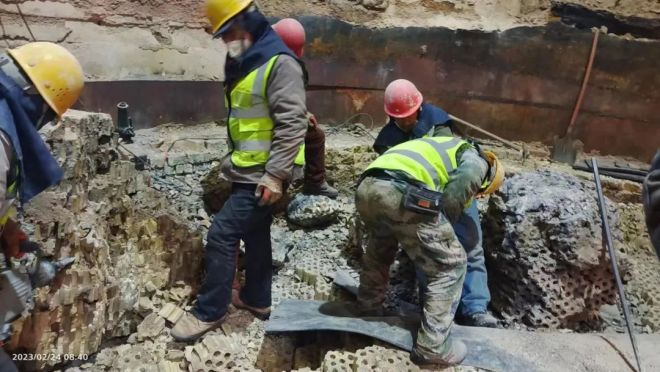 豫興公司技術(shù)團(tuán)隊(duì)進(jìn)熱風(fēng)爐內(nèi)查看后發(fā)現(xiàn),蓄熱體格子磚床面已全部被粉塵及渣蝕堵塞,上部高溫區(qū)域格子磚板結(jié)為一體,板結(jié)厚度約1.5米,且格子磚床面下沉約2米;支撐拱頂直段的托板及內(nèi)層爐殼已經(jīng)嚴(yán)重碳化損壞成分層狀和粉末狀,存在極大的安全隱患,不言自明!