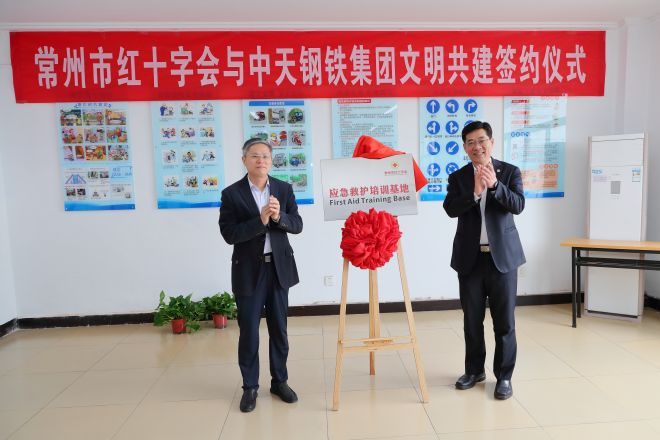 中天鋼鐵集團執行董事、副總裁、黨委副書記、工會主席李軍代表集團與常州市紅十字會簽訂戰略合作協議,并為中天鋼鐵應急救護培訓基地揭牌。雙方將不斷深化合作內容,共同推動紅十字中天應急救護基地建設向更高標準邁進,著眼打造省級救護培訓基地,力爭創建國家級培訓基地。雙方以“文明中天 ‘救’在身邊”行動為引領,大力傳播“人人學急救、急救為人人”理念,不斷發揮基地安全教育、素質拓展、示范引領的作用,持續為全體職工開展應急救護知識技能的培訓教育,構建應急救護培訓的示范性服務平臺和安全教育體系。