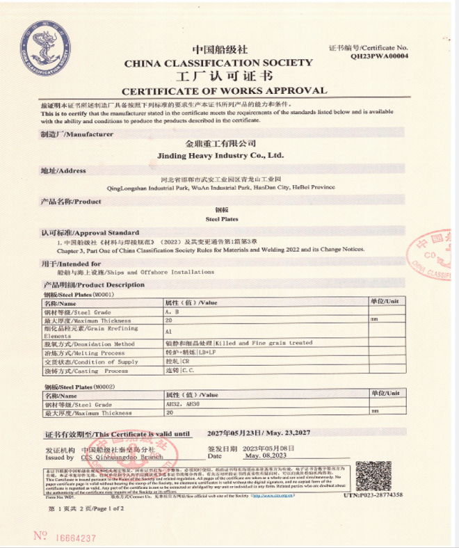 近日,金鼎鋼鐵集團有限公司通過了中國船級社對企業船板的現場審核,再次獲得中國船級社的資質認可,并頒發《中國船級社工廠認可證書》,又一次表明“金鼎牌”鋼板滿足國家及船級社相關的規范要求。